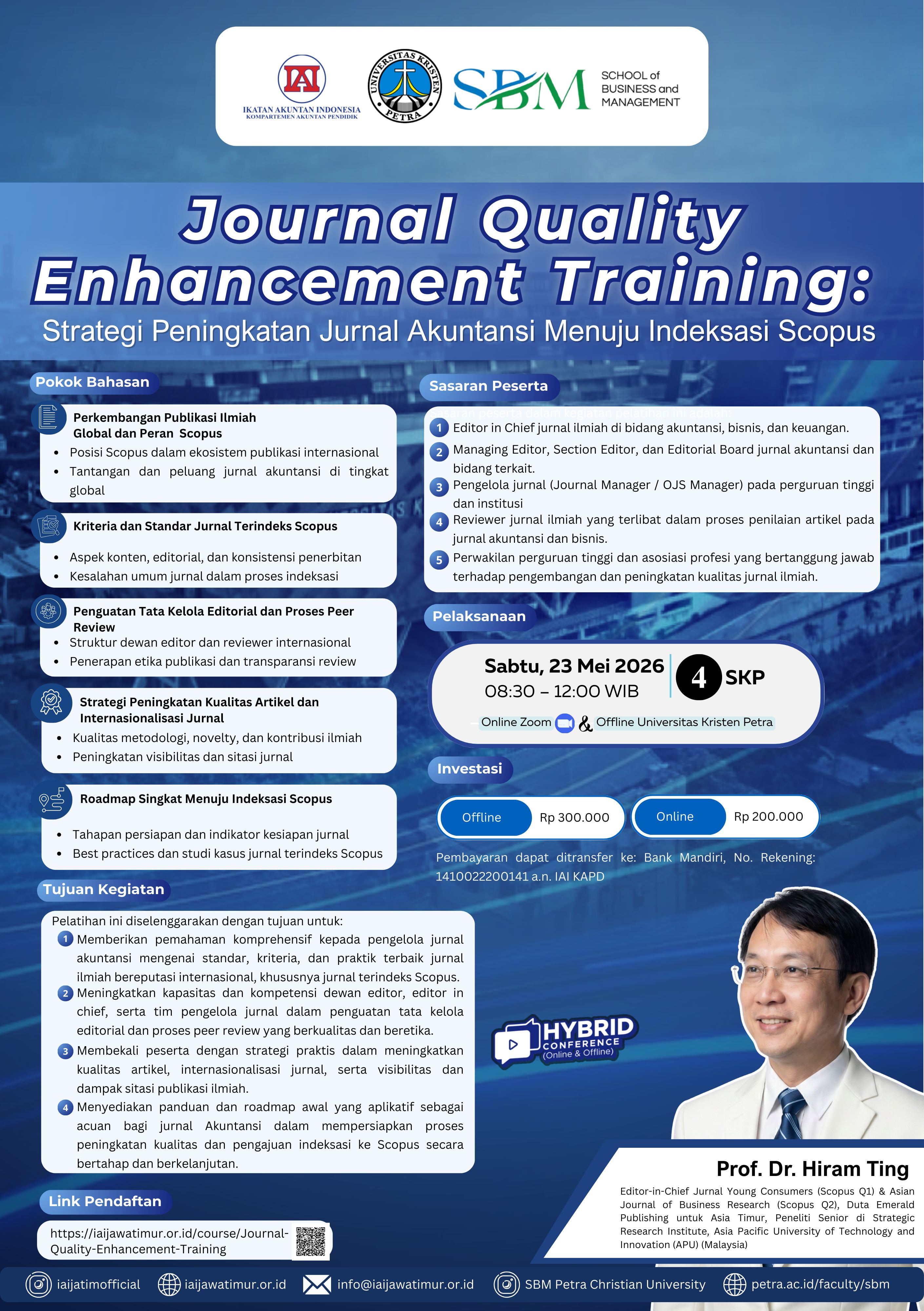 Sehubungan dengan hal tersebut, Universitas Kristen Petra bekerja sama dengan Forum Dosen Akuntansi Perguruan Tinggi (FDAPT) Jawa Timur/Ikatan Akuntan Indonesia (IAI) Wilayah Jawa Timur Bidang Akuntan Pendidik menyelenggarakan Journal Quality Enhancement Training dalam rangkaian kegiatan PIBACC 2026. Pelatihan ini dirancang untuk memberikan pemahaman komprehensif dan strategis kepada pengelola jurnal mengenai standar jurnal internasional serta langkah-langkah praktis dalam mempersiapkan jurnal menuju indeksasi Scopus. Melalui kegiatan ini, diharapkan pengelola jurnal akuntansi memperoleh wawasan, strategi, dan panduan praktis yang dapat diterapkan secara berkelanjutan dalam pengembangan jurnal masing-masing.