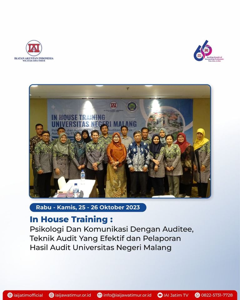 Rabu-Kamis, 25-26 Oktober 2023, Ikatan Akuntan Indonesia Wilayah Jawa Timur sukses menyelenggarakan In House Training "Psikologi Dan Komunikasi Dengan Auditee, Teknik Audit Yang Efektif Dan Pelaporan Hasil Audit" Universitas Negeri Malang yang berlangsung di Hotel Santika Premiere Malang. Pelatihan yang diikuti oleh para anggota Satuan Pengawas Internal (SPI) Universitas Negeri Malang ini bertujuan untuk memahami Psikologi dan Komunikasi Dengan Auditee, beserta Teknik Audit Yang Efektif Dan Pelaporan Hasil Audit.