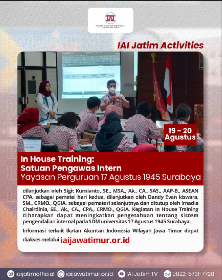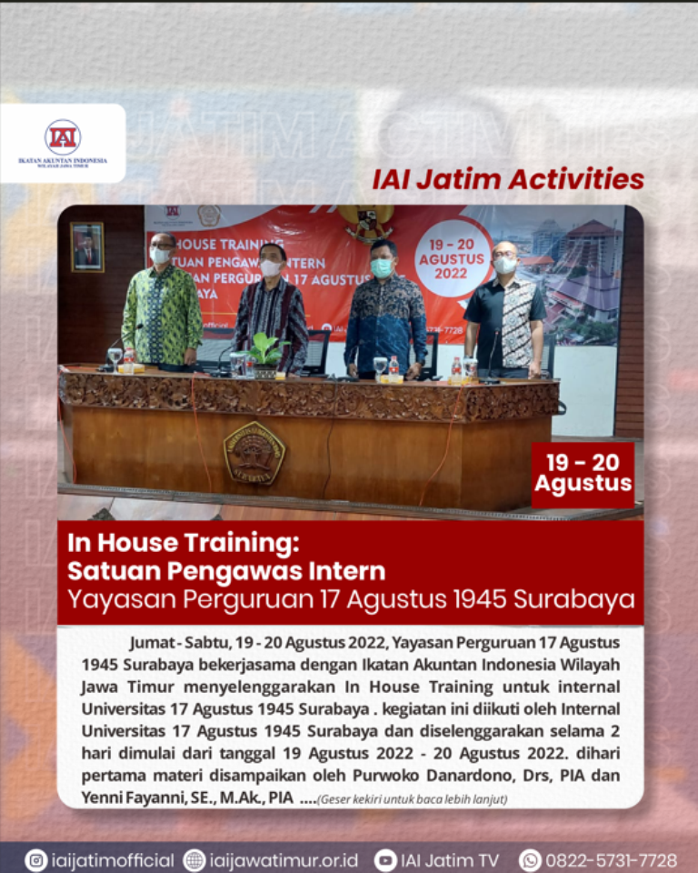 Jumat - Sabtu, 19 - 20 Agustus 2022, Yayasan Perguruan 17 Agustus 1945 Surabaya bekerjasama dengan Ikatan Akuntan Indonesia Wilayah Jawa Timur menyelenggarakan In House Training untuk internal Universitas 17 Agustus 1945 Surabaya . kegiatan ini diikuti oleh Internal Universitas 17 Agustus 1945 Surabaya dan diselenggarakan selama 2 hari dimulai dari tanggal 19 Agustus 2022 - 20 Agustus 2022. dihari pertama materi disampaikan oleh Purwoko Danardono, Drs, PIA dan Yenni Fayanni, SE., M.Ak., PIA. dilanjutkan oleh Sigit Kurnianto, SE., MSA., Ak., CA., SAS., AAP-B., ASEAN CPA. sebagai pematei hari kedua, dilanjutkan oleh Dandy Evan kiswara, SM., CRMO., QGIA. sebagai pemateri selanjutnya dan ditutup oleh Irnadia Chairdinia, SE., Ak., CA., CPA., CRMO., QGIA. Kegiatan In House Training diharapkan dapat meningkatkan pengetahuan tentang sistem pengendalian internal pada SDM universitas 17 Agustus 1945 Surabaya .
