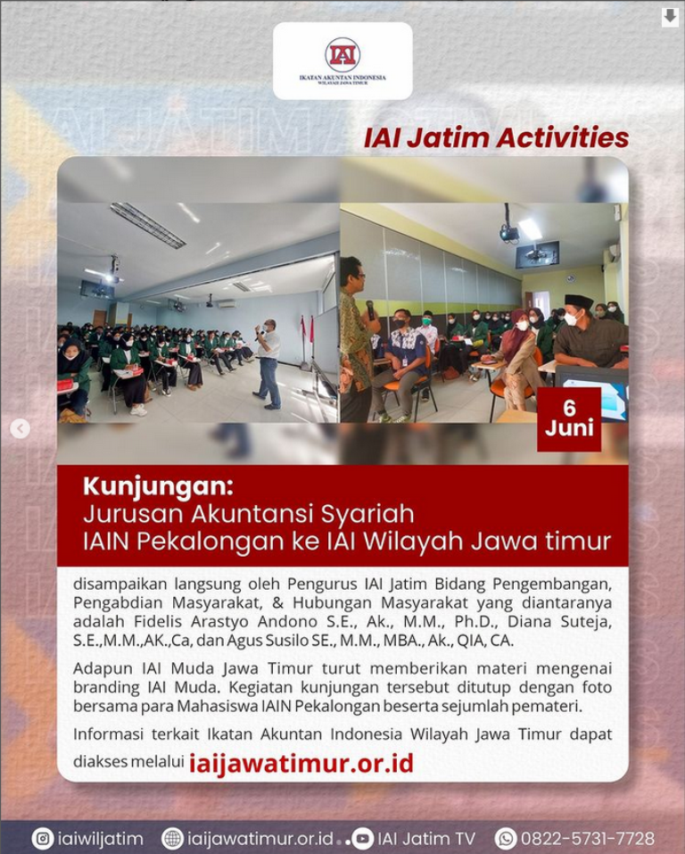 Selasa, 7 Juni 2020, Ikatan Akuntan Indonesia Wilayah Jawa Timur menerima kunjungan mahasiswa IAIN Pekalongan. dalam kunjungannya, sebanyak 120 Mahasiswa yang berasal dari Jurusan Akuntansi Syariah ini menerima berbagai materi mengenai Sejarah IAI Jatim, Program Kerja IAI Jatim, dan Kegiatan-kegiatan IAI Jatim. materi-materi tersebut disampaikan langsung oleh Pengurus IAI Jatim Bidang Pengembangan, Pengabdian Masyarakat, & Hubungan Masyarakat yang diantaranya adalah Fidelis Arastyo Andono S.E., Ak., M.M., Ph.D., Diana Suteja, S.E.,M.M.,AK.,Ca, dan Agus Susilo SE., M.M., MBA., Ak., QIA, CA.