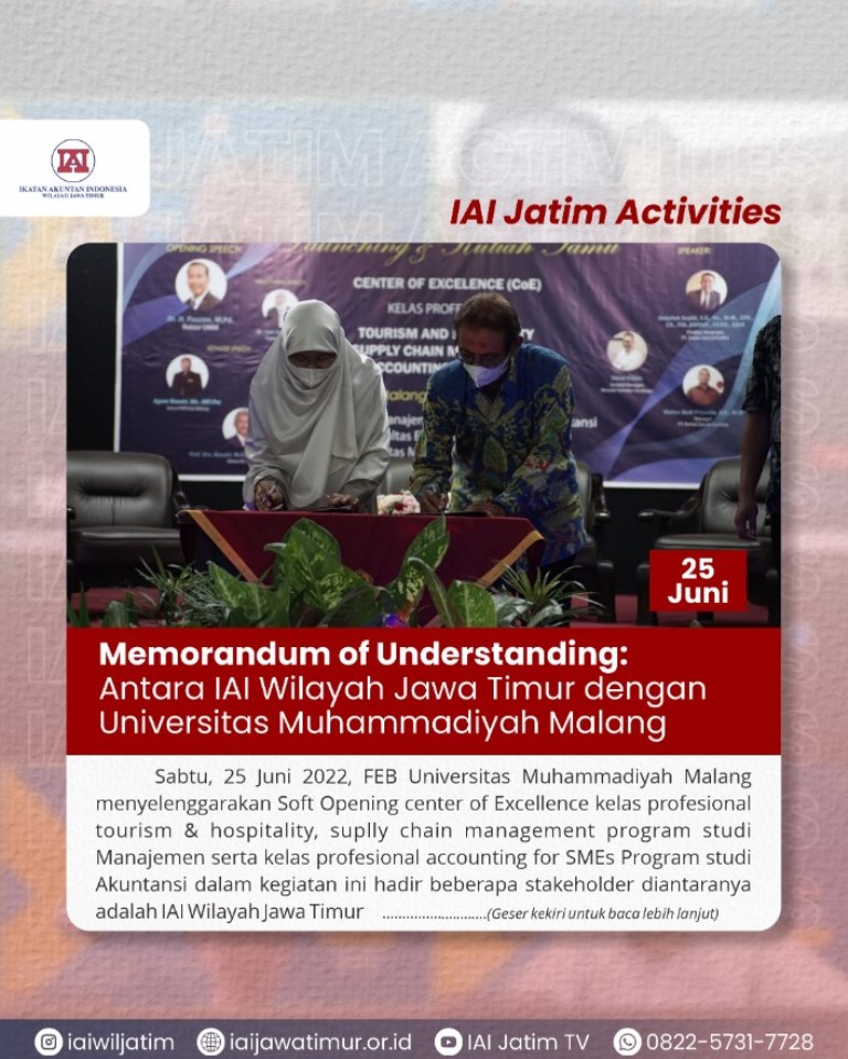 Sabtu, 25 Juni 2022, FEB Universitas Muhammadiyah Malang menyelenggarakan Soft Opening Center of Excellence kelas profesional tourism & hospitality, suplly chain management program studi Manajemen serta kelas profesional accounting for SMEs Program studi Akuntansi. Dalam kegiatan ini hadir beberapa stakeholder diantaranya adalah IAI Wilayah Jawa Timur Ketua IAI Wilayah Jawa Timur Prof. Basuki., M.Com(HONS), Ph.D., Ak., CMA., CA., ASEAN CPA. Turut hadir sebagai perwakilan IAI Wilayah Jawa Timur dan memberikan sambutan dalam acara tersebut, diharapkan setelah melakukan MOU kegiatan yang dilakukan bersama antara IAI Wilayah Jawa Timur dan Universitas Muhammadiyah Malang dapat meningkat dan berimbas baik bagi kebutuhan khususnya mahasiswa UMM maupun masyarakat umum.