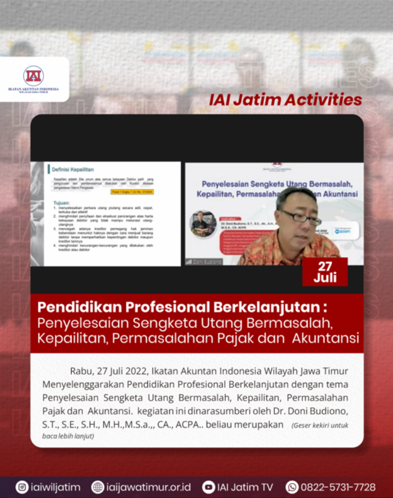 Rabu, 27 Juli 2022, Ikatan Akuntan Indonesia Wilayah Jawa Timur Menyelenggarakan Pendidikan Profesional Berkelanjutan dengan tema Penyelesaian Sengketa Utang Bermasalah, Kepailitan, Permasalahan Pajak dan  Akuntansi.  kegiatan ini dinarasumberi oleh Dr. Doni Budiono, S.T., S.E., S.H., M.H.,M.S.a.,, CA., ACPA.. beliau merupakan Anggota Bidang Akuntan Pajak Pengurus IAI Wilayah Jawa Timur, Pengurus Ikatan Akuntan Indonesia Kompartemen Akuntan Kantor Jasa Akuntan.