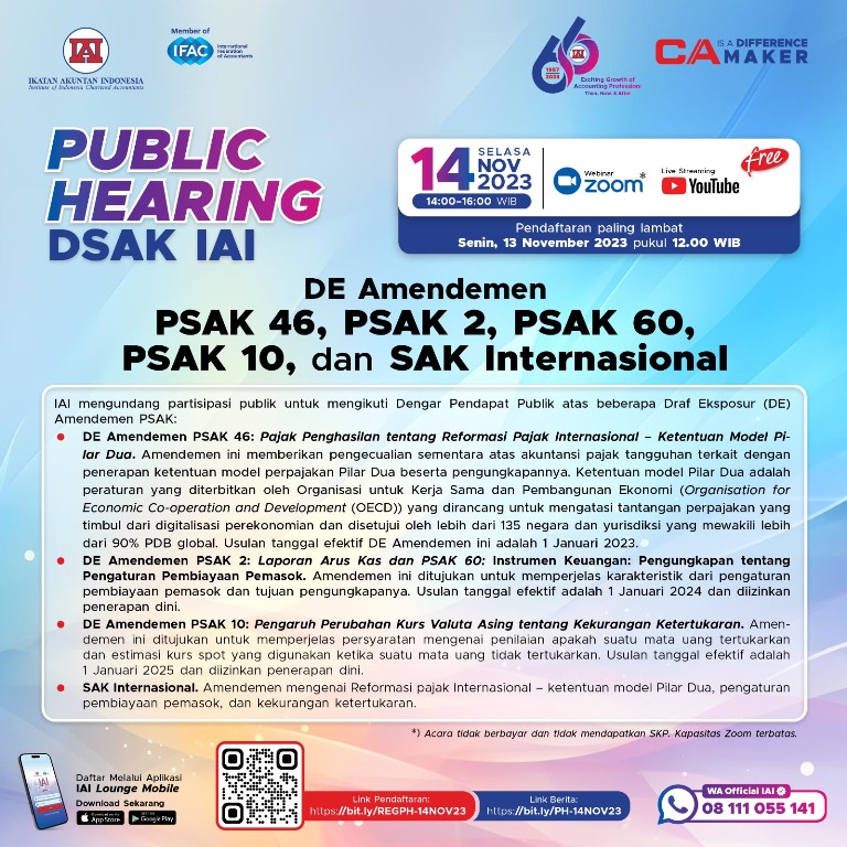 Sebagai bagian dari due process procedures penyusunan SAK, kami mengundang publik untuk hadir pada acara Dengar Pendapat Publik DE Amendemen PSAK 2, PSAK 10, PSAK 46, PSAK 60, dan SAK Internasional pada: