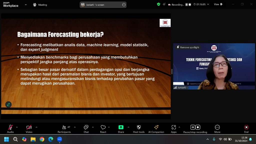 Prof. Dr. Juniarti, M.Si., Ak., CA., CMA., Kepala Bidang Rencana Strategis dan Badan Penjaminan Mutu UK Petra Surabaya, menjadi narasumber utama yang membahas berbagai teknik forecasting dan jenis-jenis peramalan yang relevan untuk berbagai kebutuhan bisnis. Beliau memberikan panduan tentang bagaimana menentukan metode forecasting yang paling efektif berdasarkan faktor-faktor spesifik dalam bisnis.