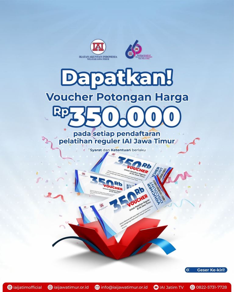 Dapatkan Voucher Potongan Harga sebesar Rp 350.000 pada setiap Pendaftaran Pelatihan Reguler IAI Jawa Timur dengan ketentuan sebagai berikut :